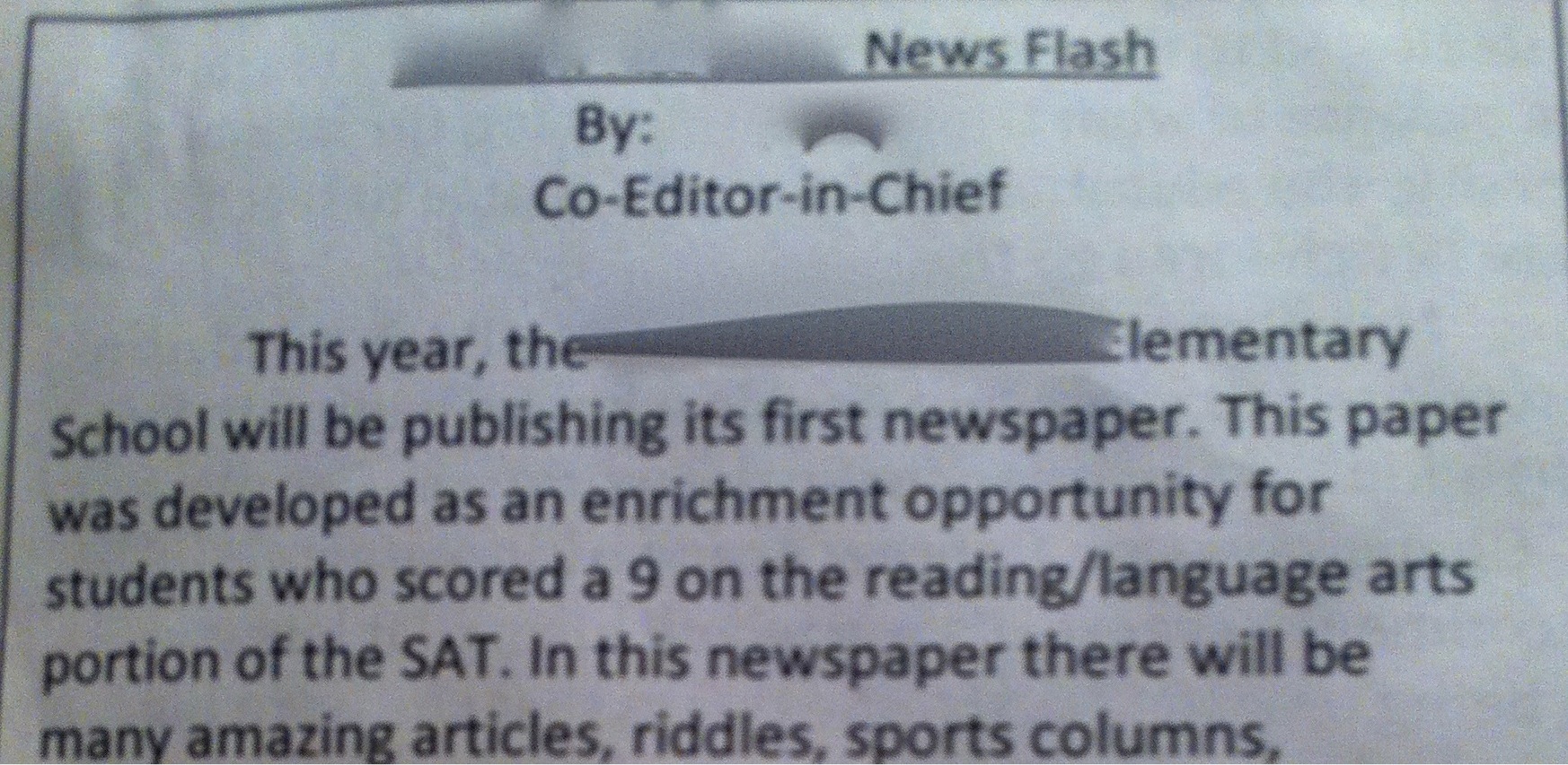 A friend of mine shared a project that her child’s school launched this year. It’s a school newspaper. I know that doesn’t seem like anything extraordinary, but this is a very special newspaper. Here is the announcement that was sent home to all the parents. I’ve blocked out the school name, even though this is so ill-conceived that a part of me wants to string them up and publicly flog whoever thought up the idea.